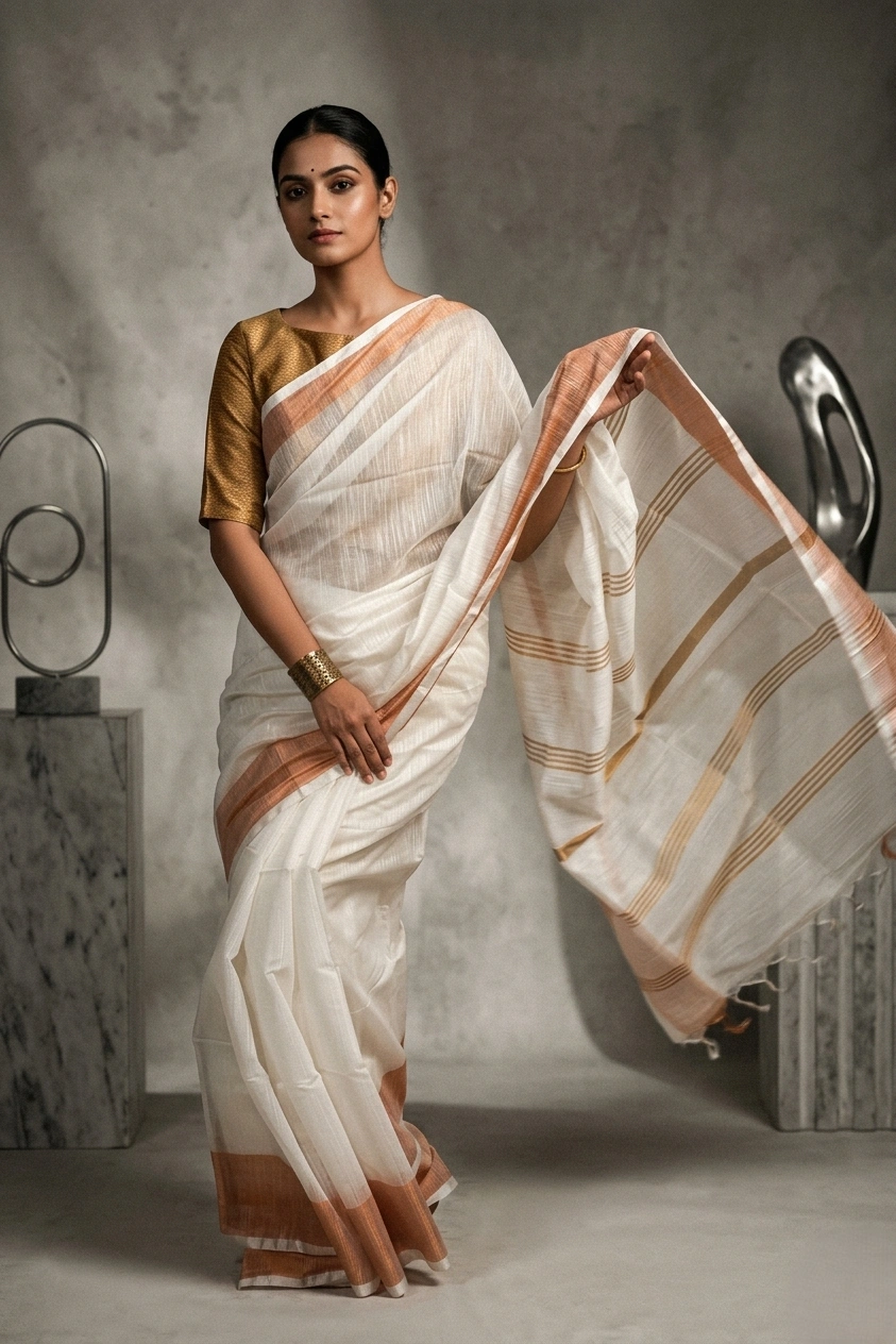 White Plain Soft Silk Saree with Golden Border is a festive saree with a plain body in a solid colour. The saree has a broad golden border on one side and a narrow golden border on the other side. The saree comes with a running blouse piece. It is a perfect fit for festivals and weddings.