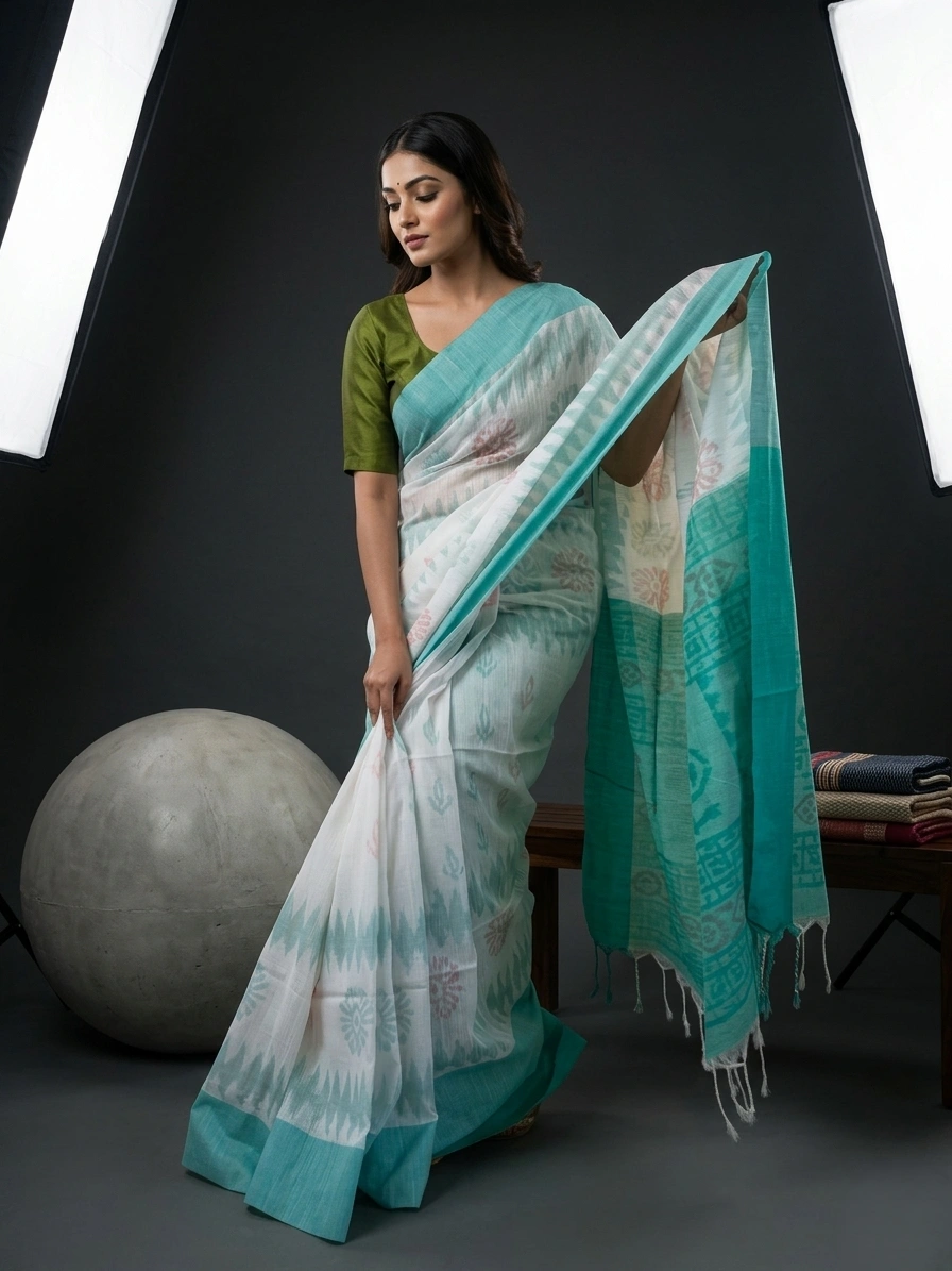 White Sambalpuri Printed Soft Cotton Saree with Green Border is a soft cotton saree with Sambalpuri Ikat prints all over the body and a contrasting border. It comes with a running blouse piece.