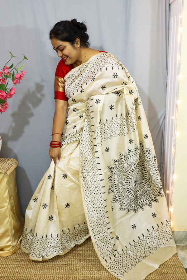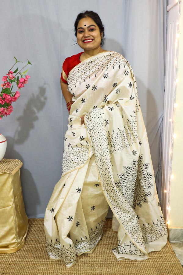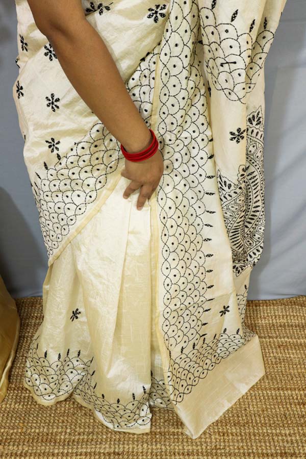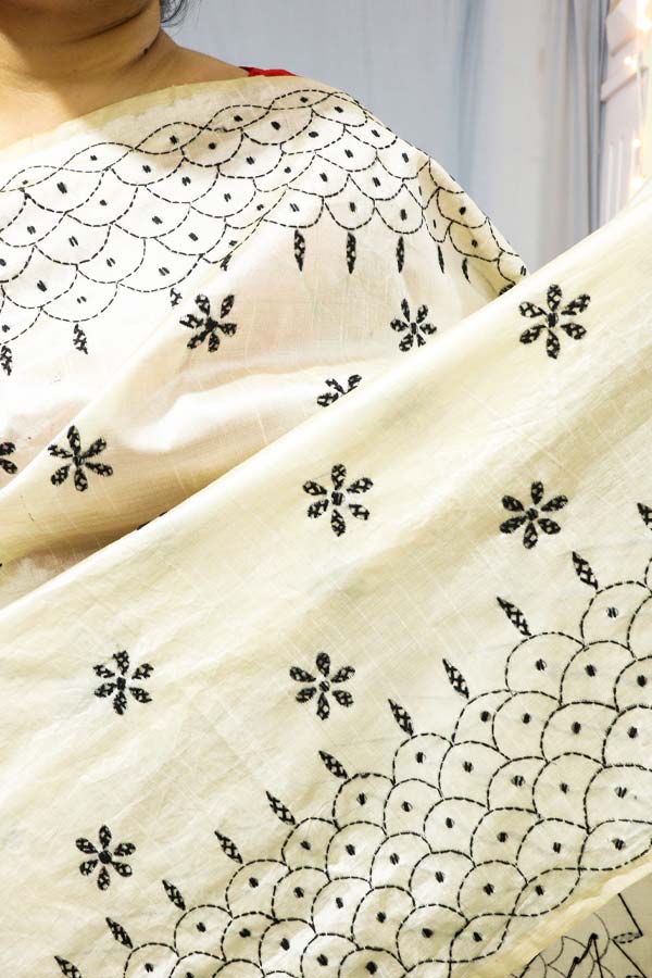 White Saree with Black Kantha Embroideries