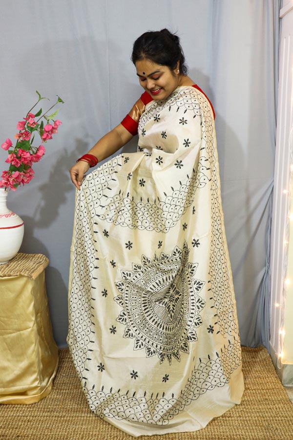 White Saree with Black Kantha Embroideries is an art silk saree with Bengal’s famous Kantha embroideries all over it. The saree is white and comes with a blouse piece. The palla of the saree has a large beautiful kantha embroidered motif.