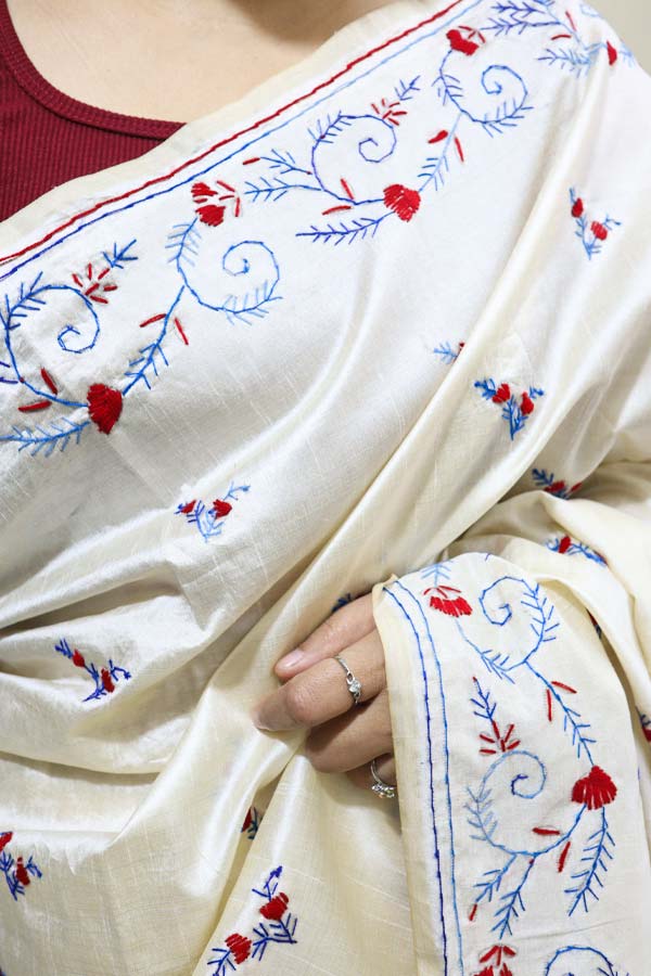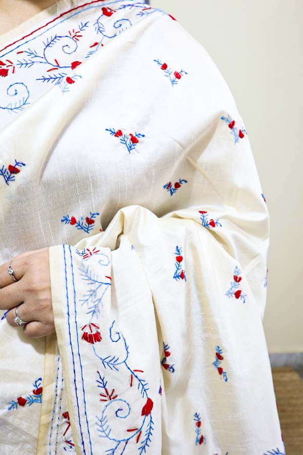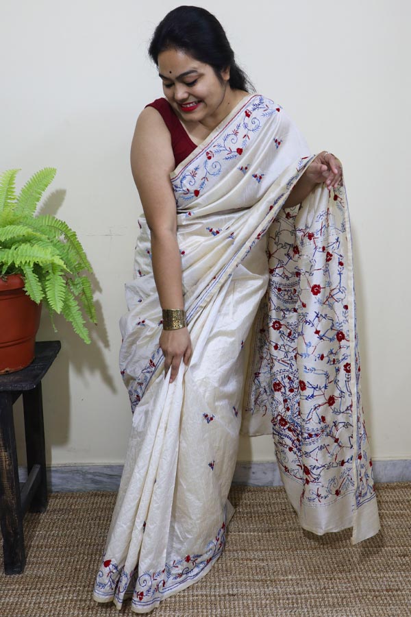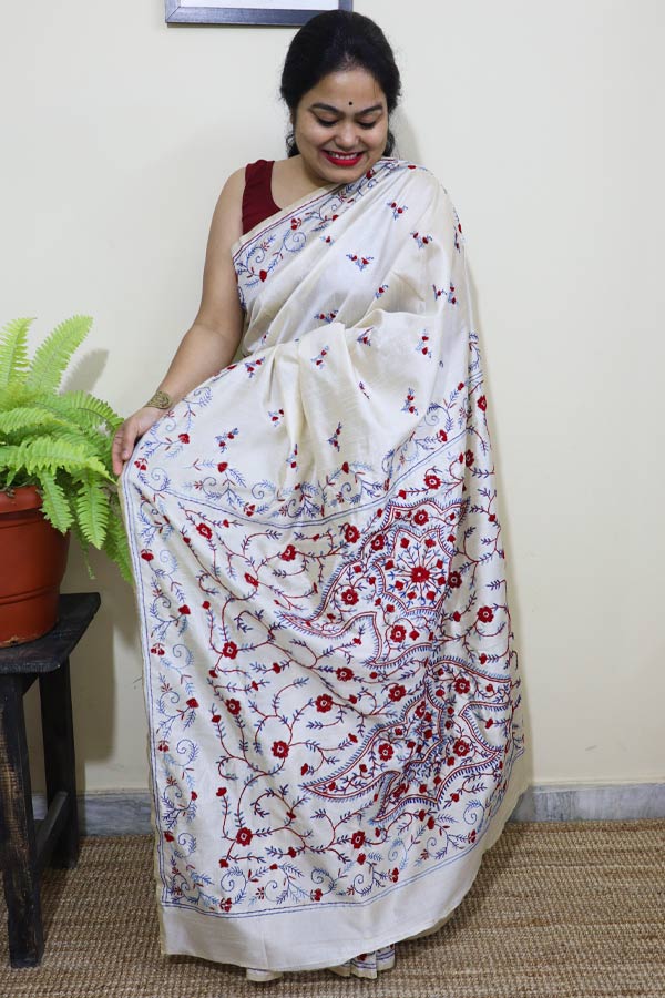 White Saree with Red Kantha Embroideries is an art silk saree with Bengal’s famous Kantha embroideries all over it. The saree is white and comes with a blouse piece. The palla of the saree has a large beautiful kantha embroidered motif.