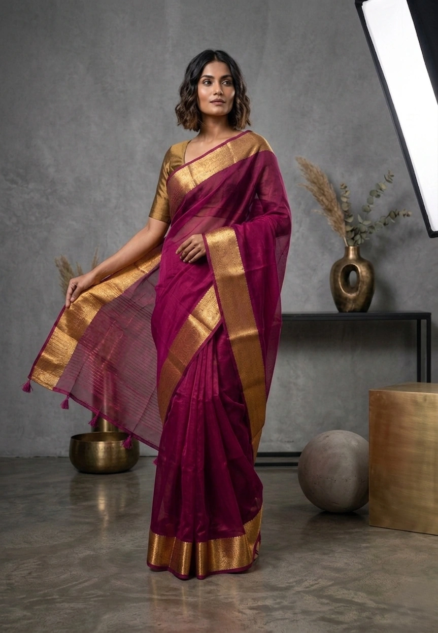 Wine Plain Semi Organza Silk Saree with Golden Border is a semi-organza silk saree with a plain see-through body in a solid colour. The borders of the saree have golden zari woven motifs. The saree comes with a running blouse piece.