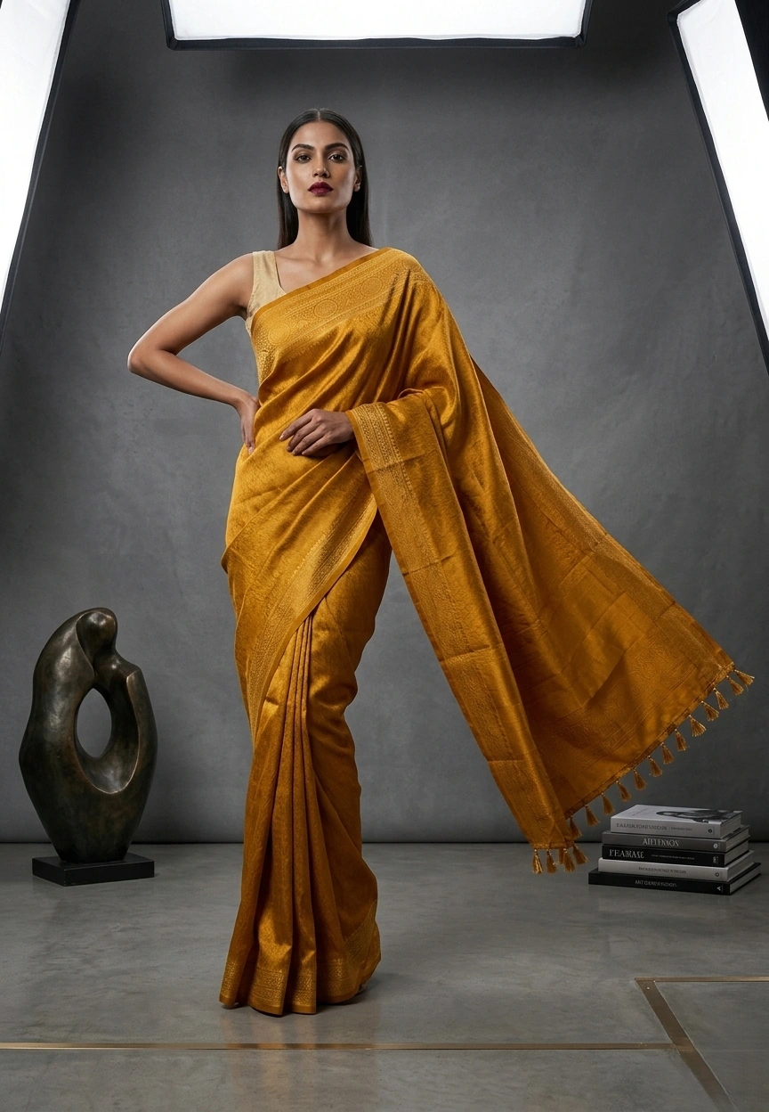 Yellow Art Silk Saree with Full Body Copper Zari Motifs is an art silk saree with full body Banarasi copper zari woven work done. The saree has a rich and soft fabric and comes with a running blouse piece.