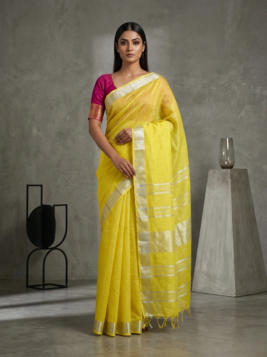 Yellow Blended Linen Saree is a solid-coloured blended linen saree with broad silver zari borders. The saree is made of rich fabric and comes with a running blouse piece.