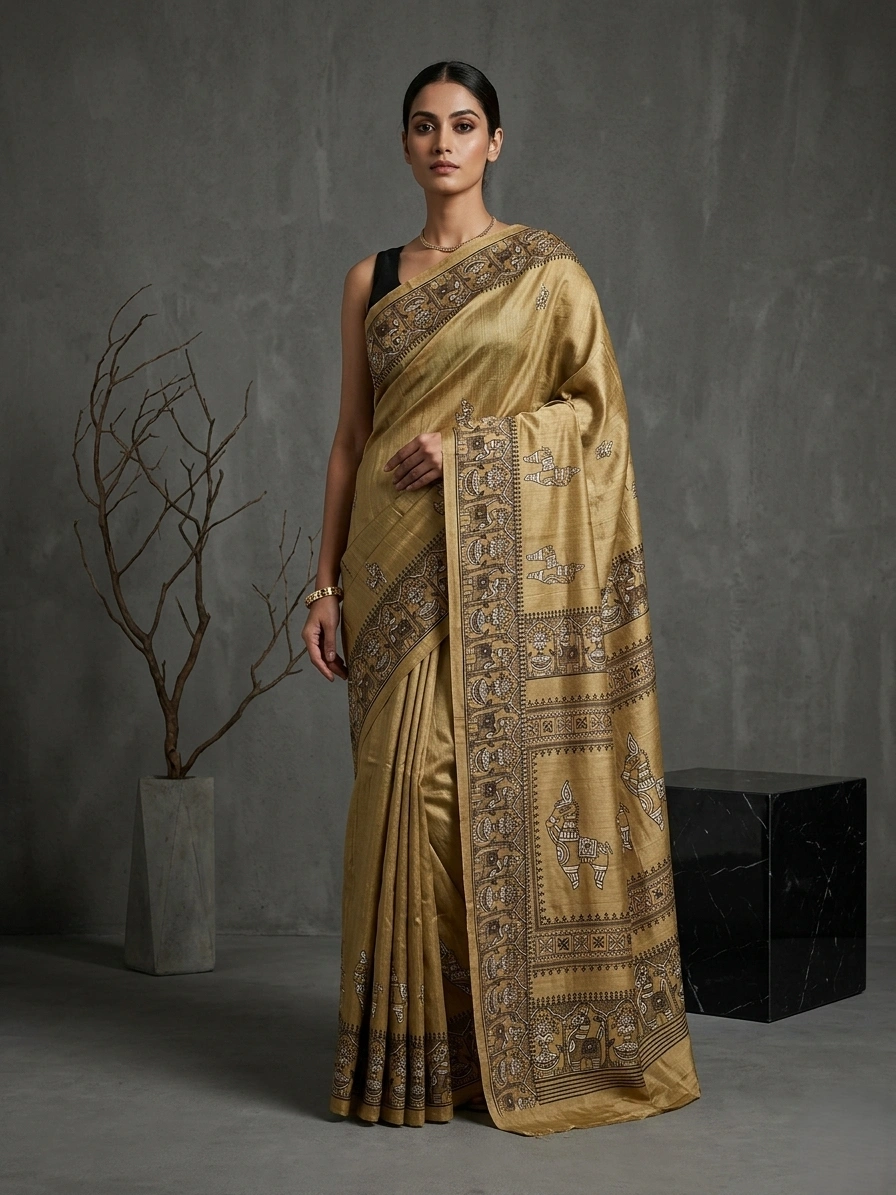 Mocha Mousse Terracotta Horse Printed Semi Silk Saree